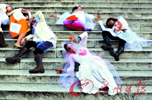 11月20日,一群女子在羅馬一廣場穿著帶血點的結(jié)婚禮服抗議家庭暴力。