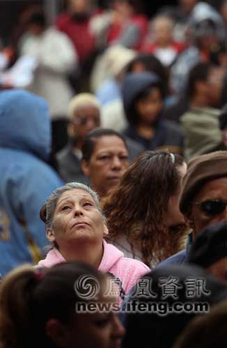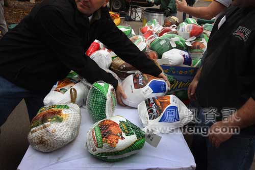 2008年11月25日,美國科羅拉多州丹佛市,人們在寒風(fēng)中排隊等待領(lǐng)取感恩節(jié)的免費火雞和其他食物。丹佛市的慈善機構(gòu)計劃在感恩節(jié)之前向大約1200戶有需要的困難家庭發(fā)放感恩節(jié)食物。