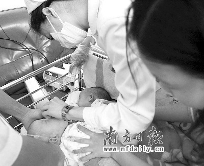 今年9月5日,化州市笪橋鎮(zhèn)一婦女產(chǎn)下一對連體女嬰。9月8日,連體女嬰被送到深圳市兒童醫(yī)院檢查治療。經(jīng)醫(yī)院檢查發(fā)現(xiàn),連體姐妹各自擁有一個(gè)肝臟,只是兩個(gè)肝臟連在一起,分離手術(shù)的成功率很大。院方?jīng)Q定前日上午9時(shí)進(jìn)行手術(shù)。