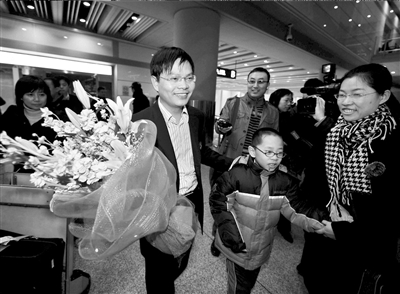 昨日,從泰國返回北京的中國公民黃忠(左二)走出機場