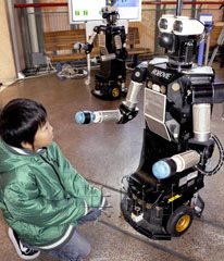 據(jù)日本共同社報道,原來這是國際電氣通信基礎技術研究所(ATR,京都府精華町)等單位開展的一項機器人試驗項目。身高114厘米的“Robovie-II”機器人擅長“察言觀色”,對于猶豫不定的客人,它會一邊招手一邊接近客人,詢問“需要幫忙嗎?”,隨后用聲音或動作帶客人前往想去的地方。