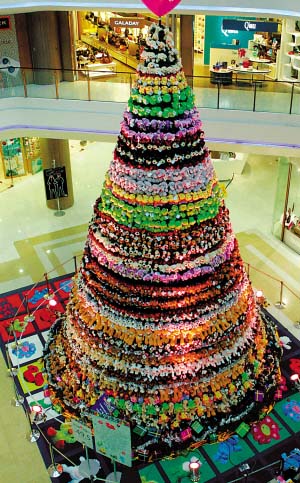 2008年是特殊的一年,除舊迎新之際,圣誕樹和它的主人也以特殊的方式奉獻(xiàn)愛心。在裝修一新的353廣場中庭,樹起了一棵由2353個(gè)卡通玩偶組成的“玩具圣誕樹”,整棵樹高12米,消費(fèi)者可以花49.5元認(rèn)購其中任何一只玩具,并獲贈(zèng)商家送出的愛心相框留念,日后,這些玩具將被發(fā)往地震災(zāi)區(qū)的學(xué)校,捐給那里的小朋友。