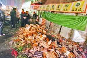 昨日下午,小吃店周圍的地面上遍布油漬和水跡,幾名男店員將倒塌的外墻瓦礫鑿開、運(yùn)走。對(duì)于事發(fā)時(shí)的情況,店員均不愿多談。據(jù)目測(cè),坍塌的外墻寬約3米,高約2.5米。