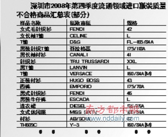 寶姿、芬迪(FENDI)、阿瑪尼(EMPORIOARMANI)等國際頂級品牌出“問題”了。深圳市工商局近日發(fā)布了深圳市第三、四季度流通領(lǐng)域服裝、進(jìn)口服裝質(zhì)量監(jiān)測情況。結(jié)果顯示,被抽查的101批次國產(chǎn)服裝中有34批次不合格,被抽查的30批次進(jìn)口服裝中則有18批次不合格,合格率僅為40%.