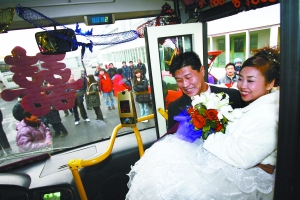 昨日,兩輛公交車成了一對(duì)新人的“重量級(jí)”婚車。新郎于浩是公交車司機(jī),新娘賈春穎是公交站調(diào)度員。新郎抱著新娘上車時(shí),司機(jī)說(shuō)“先生請(qǐng)刷卡”。