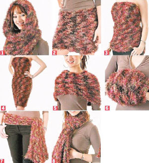 據(jù)英國媒體15日報道,席卷全球的金融危機讓很多愛好時裝的女性被迫減少了逛時裝商場的次數(shù),不過,美國馬薩諸塞州的“魔法圍巾公司”卻為消費者設(shè)計出了一條足以應(yīng)付金融危機的“魔法圍巾”,這條圍巾竟能變成9種不同的服裝道具:它既可以變成頭巾、圍巾、披肩和腰帶穿戴,同時也能充當抹胸背心、無袖女裝和迷你裙。