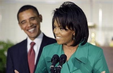這位準(zhǔn)第一夫人每次的著裝都很嚇人,不過(guò)這身綠色的職業(yè)裝真的很適合他。簡(jiǎn)單的剪裁與冷色系的顏色為她增加了一絲高貴大方的感覺(jué)。用心吹過(guò)的頭發(fā)充滿時(shí)尚感,前面的發(fā)簾與蓬松的感覺(jué)都讓她充滿了女人的味道,難怪站在他身后的奧巴馬都深情含笑的望著她。