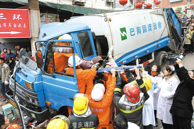事故后不久,消防官兵和交警先后趕到現(xiàn)場(chǎng)。運(yùn)渣車車頭嚴(yán)重變形,消防員迅速用破拆工具救出了環(huán)衛(wèi)工人張先陽(yáng)和李國(guó)華,但營(yíng)救最后一個(gè)被卡環(huán)衛(wèi)工尹修正時(shí)遇上困難。尹修正的腿已經(jīng)從變形車門的裂縫中伸出車外,因其全身被卡,消防無(wú)法實(shí)施協(xié)助救援,硬拉又怕其難忍疼痛,他們只有一點(diǎn)一點(diǎn)地邊擴(kuò)張、邊移動(dòng),最后又因空間狹窄,只得用起重機(jī)將運(yùn)渣車向后拖移了20厘米,1個(gè)半小時(shí)才將尹修正救出。隨后,他被緊急送往新橋醫(yī)院。據(jù)了解,傷者全都脫離生命危險(xiǎn)。中午12點(diǎn)半,運(yùn)渣車最終被運(yùn)走。此次救援工作耗時(shí)4個(gè)小時(shí)。