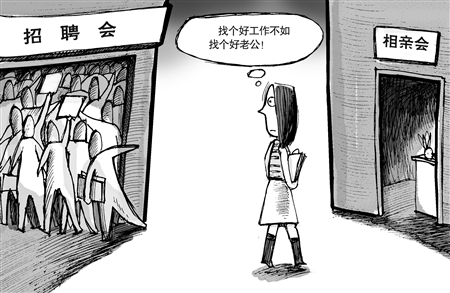 受金融危機(jī)影響,今年高校畢業(yè)生的就業(yè)壓力比較沉重,“男靠家,女靠嫁”、“找個(gè)好工作不如找個(gè)好老公”的觀念開始在高校部分女生中出現(xiàn),婚姻成為不少女生的另一條“退路”。在征婚時(shí),有一定的經(jīng)濟(jì)基礎(chǔ)和穩(wěn)定收入成為她們的首要條件。