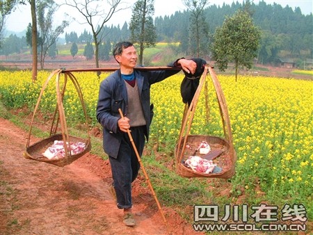 “割肉喲——”上午11點(diǎn)鐘,菜花叢中飛出抑揚(yáng)頓挫的聲音。循聲追去,見一盲人挑著肉擔(dān),拿著竹竿在鄉(xiāng)間小道上邊摸索前行,邊高聲吆喝。“他就是楊中模!”村民說。