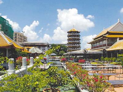 記者遠(yuǎn)遠(yuǎn)就看到了馬路邊上的飯店,就像一片蘇州園林。黃瓦紅柱、亭臺(tái)樓閣、小湖假山,完全是中式風(fēng)格。走進(jìn)大門,先看到一塊牌匾,上面是放大的吉尼斯世界紀(jì)錄證書,這份發(fā)放于1992年的證書上面記載的是:飯店面積8.35英畝(約合3.38萬平方米),員工1200名,可提供5000人同時(shí)就餐。記者在這里完全體會(huì)不出是在外國,吃的是中國菜,菜單上也有中文。據(jù)介紹,泰國大部分大型娛樂設(shè)施都是華人老板,這座“龍城花園酒家”也不例外。
