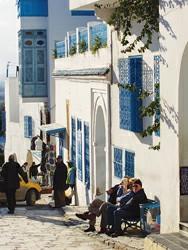 有一幢房屋,綠色的樹和紅色的花緊貼著白墻生長,只露出藍(lán)色的門窗。我恍惚起來,這不是童話里最迷人的場景嗎?在這樣的場景里,藍(lán)色的門被推開,走出了童話里的阿拉伯公主,她回眸一笑,然后沿著鵝卵石小街邊的臺階,一步步地走下去,走到一望無際的地中海邊。我也沿著臺階走下幾步,那里是一個(gè)露天咖啡館,坐在木質(zhì)長椅上,點(diǎn)一杯突尼斯人最愛喝的薄荷茶,倚著欄桿,面朝大海,不知不覺間人便沉靜了下來,漸漸地好像融化在純凈的藍(lán)色與白色里。