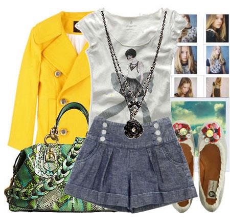 與海軍風(fēng)的高腰牛仔裙褲相搭配,加上香奈兒風(fēng)格的山茶花長項(xiàng)鏈,打造年輕時(shí)尚。