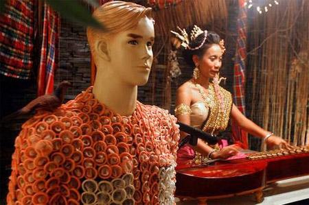 進入餐廳的室內(nèi)區(qū),就像進入安全套的博物館。墻壁上都是全球具有代表性的安全套產(chǎn)品的展覽,按照國別分裝在各自的格子里,不同的材料、顏色、形狀,漫步一圈能大致了解安全套的發(fā)展史。屋頂?shù)牡鯚粢惨园踩鬃鳛檠b飾,閃出不同顏色的光芒。餐桌設計也很獨特,桌面玻璃板的圖案是由安全套組合完成。靠墻的餐桌旁還能欣賞到一幅幅被“加工”過的名畫,連舉世聞名的蒙娜麗莎也客串了一回安全套的宣傳大使,手中拿著安全套沖著客人微笑。