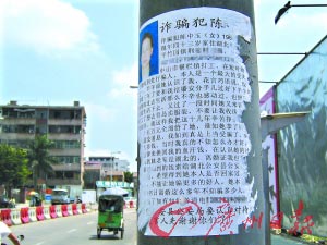 中山雅商律師事務(wù)所的律師封謨喜對記者表示,“公開把別人的身份資料貼在公共場合,這是違法的行為。輕則違反《治安管理處罰條例》,重則構(gòu)成了犯罪。如果貼了幾十張,這種行為其實算是比較嚴重了!贝送,封律師對記者表示,未經(jīng)審判,直接稱他人為“詐騙犯”,這也是侵害名譽權(quán)的行為。封律師表示,若認定被詐騙可向公安部門報案(記者張堅攝影報道)