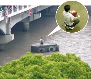 寧波東方熱線、天一論壇5月20日出現(xiàn)多個(gè)名為《江廈橋下,上演求愛秀》的帖子,帖子中的照片顯示一男子手捧玫瑰花蹲在江中的防撞墩上。他是怎么下去的?是純粹作秀,還是真情表白?網(wǎng)友發(fā)現(xiàn)后趕緊報(bào)警,警方調(diào)查后得知,該男子為向相戀4個(gè)月的女友證明自己是多么愛對(duì)方,上演了一出瘋狂之舉。他手捧玫瑰花,單手“橫渡”奉化江,游了40多米后,爬上江心的防撞墩,隨后擺出“思想者”等各種造型(下圖)。