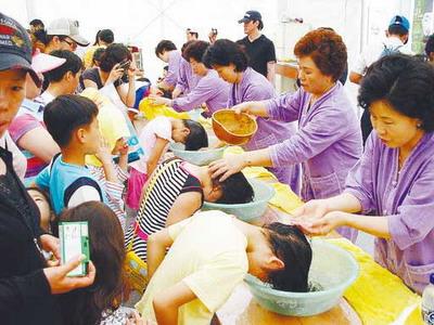 隨后,朋友陪同記者參加慶;顒樱浾呖吹焦媚飩冇幂牌迅龀婶⒆觿e在頭上,男人們則將菖蒲根纏在腰上。朋友說,這象征可以防止頭痛和災厄的發(fā)生。慶;顒又杏泻芏鄡x式,孩子用菖蒲水洗頭發(fā),祈求健康;人們點燃許愿燈,祝愿家人平安。來自農村的民俗表演是整個活動中最熱鬧的。小伙子舞動繪有龍圖案和寫有“農者天下之大樂”等字樣的大旗,身穿韓服的人們邊敲鼓邊圍成圈跳舞,一些人則裝扮成小丑,穿插在隊伍里,場面很熱鬧,他們用這種形式表達豐收的喜悅。朋友說,端午最有代表性的娛樂活動就是女性聚在一起蕩秋千,男人聚在一起摔跤。端午當天,也有將曬干的艾葉放在大門旁邊以除災驅邪的習俗,韓國人喝菖蒲酒,還將扇子作為禮物贈送,不少商家趁此機會熱賣扇子。