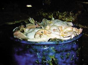 日前,南海當(dāng)?shù)卣鶕?jù)記者提供的線索,執(zhí)法搗毀了多個死鵝、死鴨加工點。在記者暗訪過的一個位于荒地和臭水溝旁的窩點,執(zhí)法部門發(fā)現(xiàn)了堆放在桶里和冰柜里的上百只死家禽,有的已腐爛發(fā)臭。用來給死家禽脫毛的瀝青不知反復(fù)使用了多久,臭味很重。據(jù)查,每天僅這個作坊加工、販賣的問題家禽就有四五百只。