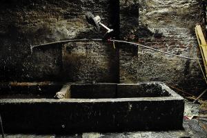 一間地下作坊里,褪了毛的鴨鵝隨意塞在一個桶里
