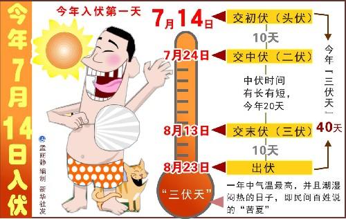 據(jù)了解,從夏至日開(kāi)始算起,第3個(gè)“庚日”即為入伏,第4個(gè)“庚日”為“中伏”;從立秋開(kāi)始算起的第1個(gè)“庚日”為“末伏”的始日,第2個(gè)“庚日”定為出伏,“三伏天”才宣告結(jié)束。