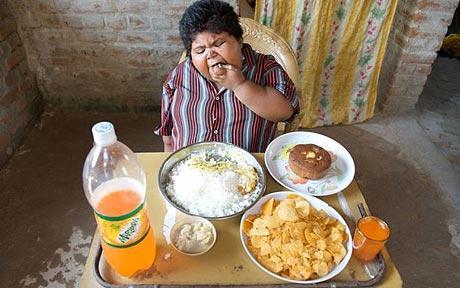 這個女孩名叫蘇曼·卡圖恩,住在印度西孟加拉邦。她一周要吃掉10公斤大米、24個雞蛋,6升牛奶和5公斤土豆。饑餓常常驅使她溜到鄰居家找食物。