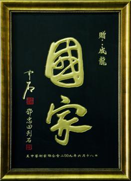 纖維玉石雕刻的書(shū)法作品《國(guó)家》是由中國(guó)知名雕刻家、書(shū)法家邵忠田先生特別雕刻制作,并贈(zèng)送給成龍先生的。據(jù)了解,纖維玉石是一種鮮為人知的礦石,孕育在位于長(zhǎng)江和黃河之間的秦嶺深處,這種特殊玉石歷經(jīng)幾億年形成,深埋地下,柔軟如膠,一經(jīng)開(kāi)采出來(lái),迅速變得致密堅(jiān)硬,質(zhì)地細(xì)膩,溫潤(rùn)光澤,是雕刻方面的最佳選材,迄今未在世界其他地方發(fā)現(xiàn),極具收藏價(jià)值。