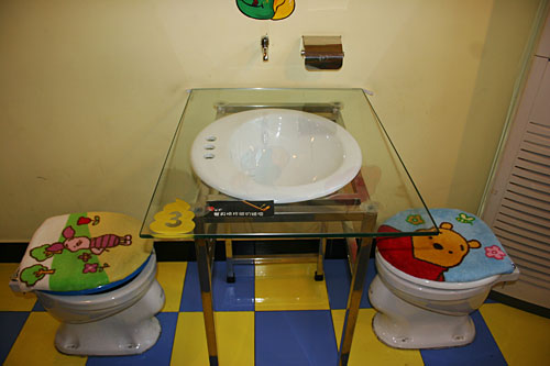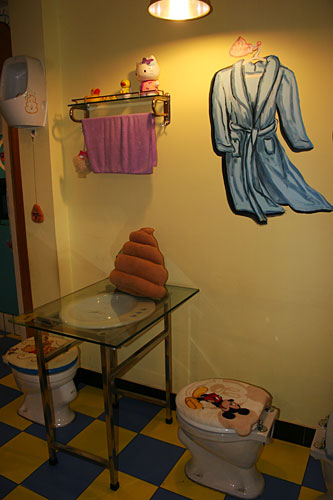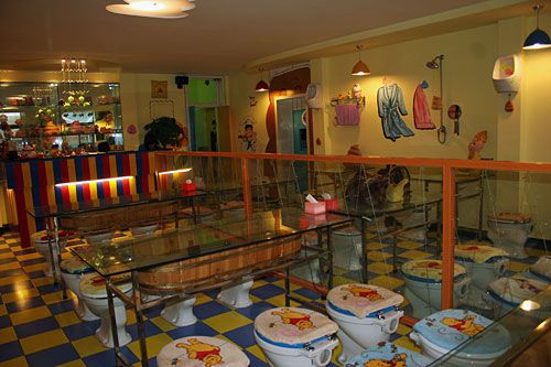 小小的門面,狹窄的樓梯。走上二樓后,這個布置得充滿了童趣的餐廳才展現(xiàn)在食客面前。這里的每把座椅都是一座標準的沖水馬桶。盛放主餐的不是盤子,而是微型馬桶,冷飲則大都放在“蹲坑”形狀的便器里。好在這些餐具造型卡通,并不會讓人大倒胃口。