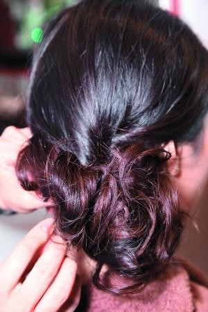 Step2將兩側的頭發(fā)向外卷曲,將兩側頭發(fā)向后扭,夾在馬尾之上,用發(fā)夾固定。