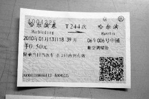 倪先生說,日前,他在論壇看到有人說能買到這么便宜的火車票,覺得很好奇,就去了家門口的一家火車售票點,買到了5毛錢的硬臥火車票,外加5塊錢手續(xù)費,“那個賣票的小伙子都震驚了,他都不知道有這么便宜的票。”倪先生,這兩站之間有八九公里,坐公交車按照當?shù)貎r格得一塊錢吧!庇浾呖吹,這是一張1月13日哈爾濱東開往哈爾濱的T244次新空調(diào)硬臥中鋪票,價格處印著“0.5元”。倪先生說,他買這張票只為收藏,不會真的去乘坐。