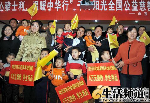 雅士利集團(tuán)山東營(yíng)業(yè)部經(jīng)理馬紅兵表示:雅士利一直以來,將公益活動(dòng)當(dāng)作自己的使命,當(dāng)作一項(xiàng)偉大的事業(yè),盡心盡力地做好它。希冀以此來回報(bào)社會(huì)多年來對(duì)雅士利品牌的信任和厚愛!雅士利人從扶貧救災(zāi),到修橋造路;從文化體育,到醫(yī)療衛(wèi)生的公益道路上永不停步,多形式向社會(huì)捐款捐資超4000萬元。雅士利將通過這項(xiàng)千萬陽光工程,并和山東省慈善總會(huì)合作,捐贈(zèng)價(jià)值50萬元的奶粉一批,對(duì)邊遠(yuǎn)地區(qū)弱勢(shì)群體,對(duì)兒童的健康和教育給予特別關(guān)愛,希望繼續(xù)將“愛心”與“溫暖”灑向齊魯大地。