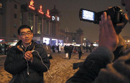 王欣欣和同伴拎著行李來到火車站。晚上8點鐘的火車,時間還有富余,他忍不住又來到售票大廳,習(xí)慣性地掏出紙筆摘錄墻上貼出的最新公告,并用手中的DV拍攝了幾個買票人的鏡頭。