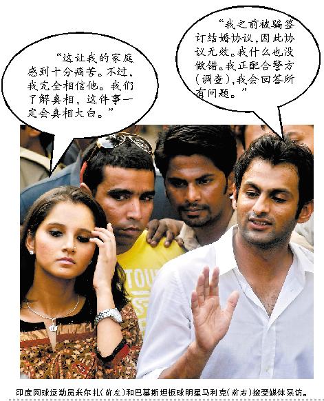 巴基斯坦板球明星舒艾卜·馬利克與印度知名網(wǎng)球運(yùn)動(dòng)員薩妮亞·米爾扎定于本月成婚,但婚禮前夕橫生枝節(jié)。印度警方5日沒收馬利克護(hù)照,禁止他離境,原因是另一名印度女子自稱已于2002年與馬利克結(jié)婚。