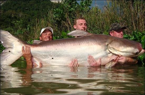 英國(guó)男子在泰國(guó)度假時(shí)捕獲一條約重90公斤的巨型鯰魚(yú)。