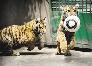 不過,還是東北虎“見多識廣”,一看就知道足球是玩具,高興地甩起了前爪開始踢球,“虎妞”、“虎寶”這對兄妹,為了搶奪這只足球真是使上了全身力氣,差點搞得兄妹反目。