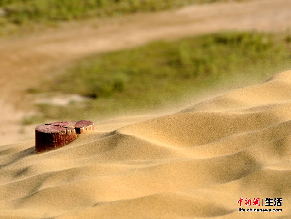 風(fēng)吹過位于庫布其沙漠邊緣的響沙灣旅游區(qū),掀起部分揚塵天氣。