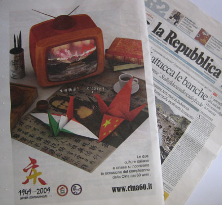 中新網(wǎng)10月3日電 據(jù)意大利《歐聯(lián)時報》報道,日前,在意大利佛羅倫薩學(xué)生學(xué)者聯(lián)誼會精心策劃下,中國國慶六十周年的宣傳廣告于10月1日被刊載在意大利共和國報紙上。廣告刊出后,引起了社會各界的高度關(guān)注,社會各界不約而同地把目光投向了中國,聚焦在中國60華誕的慶典活動。