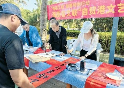 1月22日下午,在海南省三沙市七連嶼趙述島的中心廣場(chǎng)上,“翰墨飄香迎新春 筆墨濃情送祝福”志愿服務(wù)活動(dòng)正在進(jìn)行。省書法家協(xié)會(huì)的書法家們專程上島,為當(dāng)?shù)馗刹?、群眾書寫春?lián),送上祝福。和不少群眾一樣,符名友也站在桌前,雙手幫忙抻直紅紙,笑意盈盈地等待著屬于他的春聯(lián)。