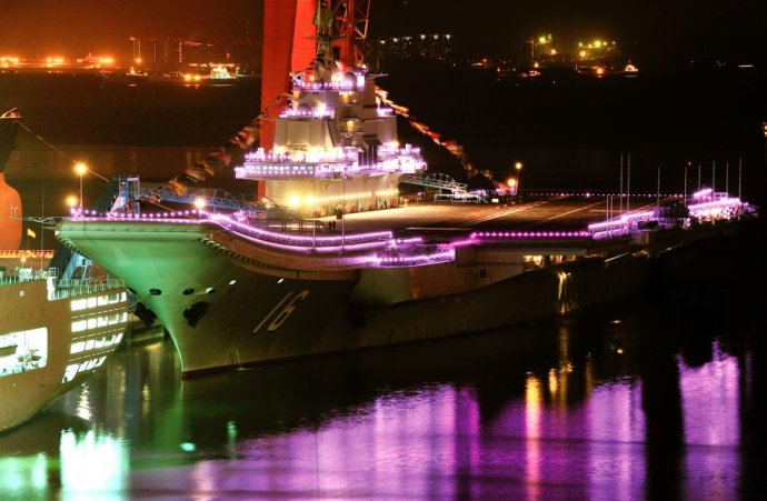 “遼寧艦”節(jié)日期間霓虹燈閃亮裝點海灣