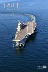 機身傾角變小,直升機減速!昂侥妇驮谇懊!”領航員通過手勢示意我們。在一望無際的海面上,一個長方形的艦影呈現(xiàn)在我們面前。這,就是讓國人魂牽夢繞的航母——“遼寧艦”。從900米高空往下看,在大海上游弋的商船或漁船,給人的感覺不過是畫家筆下輕抹的一彎細線,但是,想必沒有哪一個畫家敢把航母也畫成一彎細線。在記者的視覺里,那碩大結實的身姿起碼也應該是一道潑灑的濃墨!
