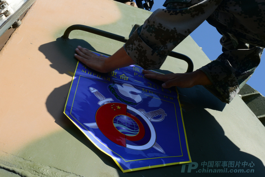 一名戰(zhàn)士給將要出征的戰(zhàn)車貼上演習(xí)圖標