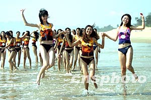 十月十三日,來自全國各地的數(shù)十名參加第九屆“模特之星”大賽的參賽模特,在廣東汕頭美麗的海灘上進行排練,展示美麗身姿。 十月十四日晚,選手們在廣州汕頭花園賓館內(nèi)進行首次個人才藝演練。