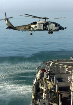 美海軍SH-60“海鷹”直升機主要用于反潛、反艦攻擊,搜索與救援等任務。它由驅逐艦搭載,“海鷹”可以裝備聲波定位器、MK46或MK50型魚雷、AGM-119型“企鵝”導彈及50口徑機炮等。