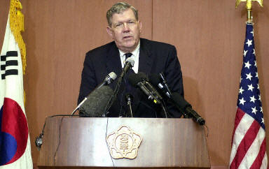據(jù)“中央社”報(bào)道,凱利以美國(guó)布什總統(tǒng)的特使身份訪問(wèn)漢城,在會(huì)見(jiàn)韓國(guó)總統(tǒng)當(dāng)選人盧武鉉之后,在漢城外交部舉行新聞發(fā)布會(huì)。