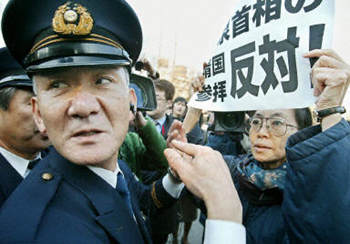 一位日本婦女在靖國(guó)神社門前手持抗議標(biāo)語,反對(duì)首相小泉純一郎參拜。