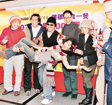 梁家輝與吳君如及其他演員陳奕迅、黃日華、張堅庭、杜汶澤、田蕊妮等同坐一席時,談笑風(fēng)生,連上臺也要搞搞氣氛,叫眾演員來個“眾星拱如”將君如捧起。吳君如為慶祝《金雞》上映兩周,票房上佳,前晚不但設(shè)慶功宴慰勞大家,還自掏腰包買了八粒小金雞答謝一班有份在片中客串演出的“嫖客”好友。