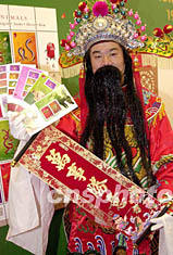 香港郵政署1月19日發(fā)行十二生肖(羊年)特別郵票,郵政署邀請財神展示羊年特別郵票首日封,并祝市民萬事勝意。鄧慶樂 攝