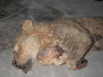 為了配合公安機(jī)關(guān)偵查,李滿堂將已經(jīng)包裹好的獅子尸體重新打開,從獅子的表情可以看出死時很痛苦,李滿堂說,大約在最近幾天,他便發(fā)現(xiàn)籠中的兩頭獅子有些不對勁,整日無精打采,不愛吃食。開始以為獅子患了感冒,給獅子吃了些消炎藥,但隨后兩天獅子仍然不見好而且厭食情況一天比一天嚴(yán)重,并開始出現(xiàn)嘔吐癥狀,隨后公園工作人員將嘔吐物送至丹東市動物檢疫站化驗。