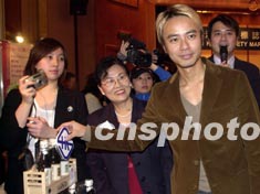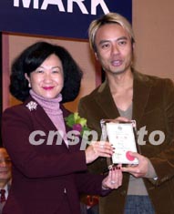 歌星李克勤1月21日在香港出席“第五屆香港安全標(biāo)志證書頒獎(jiǎng)典禮”,他從香港特區(qū)保安局局長(zhǎng)葉劉淑儀手中接過委任狀,成為2003年度之“產(chǎn)品安全大使”,將協(xié)助宣揚(yáng)產(chǎn)品安全訊息。中新社傳真 鄧慶樂 攝