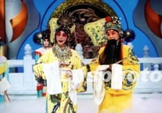著名京劇表演藝術(shù)家梅葆玖與影壇名人盧燕女士,在“2003中央電視臺春節(jié)聯(lián)歡晚會”彩排中表演京劇《太真外傳》。作者:王新