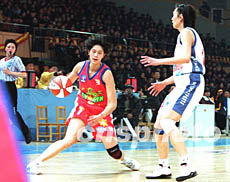 一月二十八日晚,2003中國(guó)女籃WCBA全明星賽在河北省秦皇島市奧體中心開(kāi)賽,八一隊(duì)隊(duì)員隋菲菲(左)第二次獲得聯(lián)賽最有價(jià)值球員稱(chēng)號(hào)。作者:廖文靜